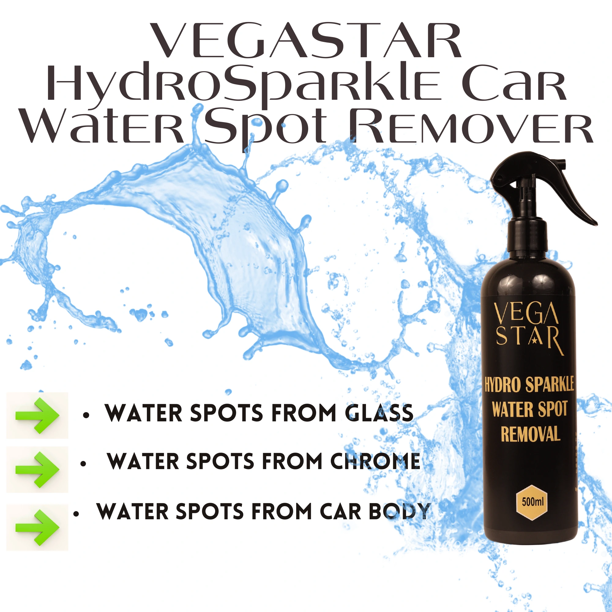 Revive your vehicle’s beauty with Vegastar Hydro Sparkle Water Spot Remover, a specially formulated cleaner designed to eliminate stubborn hard water spots on car paint, logos, glass windows, and more. This unique solution uses a mild acid formula to quickly and effortlessly lift mineral stains left by water droplets, all without causing any damage to your vehicle’s finish.